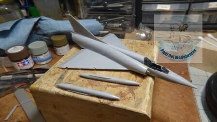 The drop tanks are next. This kit requires a surgical replacement of the rear tips of the tanks to fit a stabilizer fins used in the 1981 version of the Mirage Shahak.