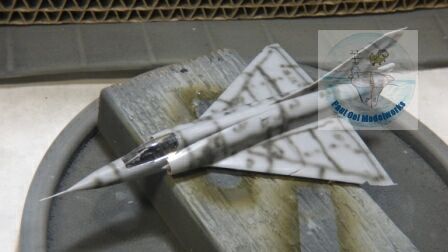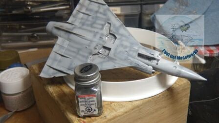 The painting scheme is relatively simple. After the undershading with Tamiya NATO Black CF-69, I applied Light Ghost Grey FS36325, followed by a freehand top side pattern of Dark Ghost Grey FS36320. The two shades are very close and in this particular scheme, it is hard to tell them apart. In photographs from the 1980s, the jets looked like they were a uniform grey appearance.