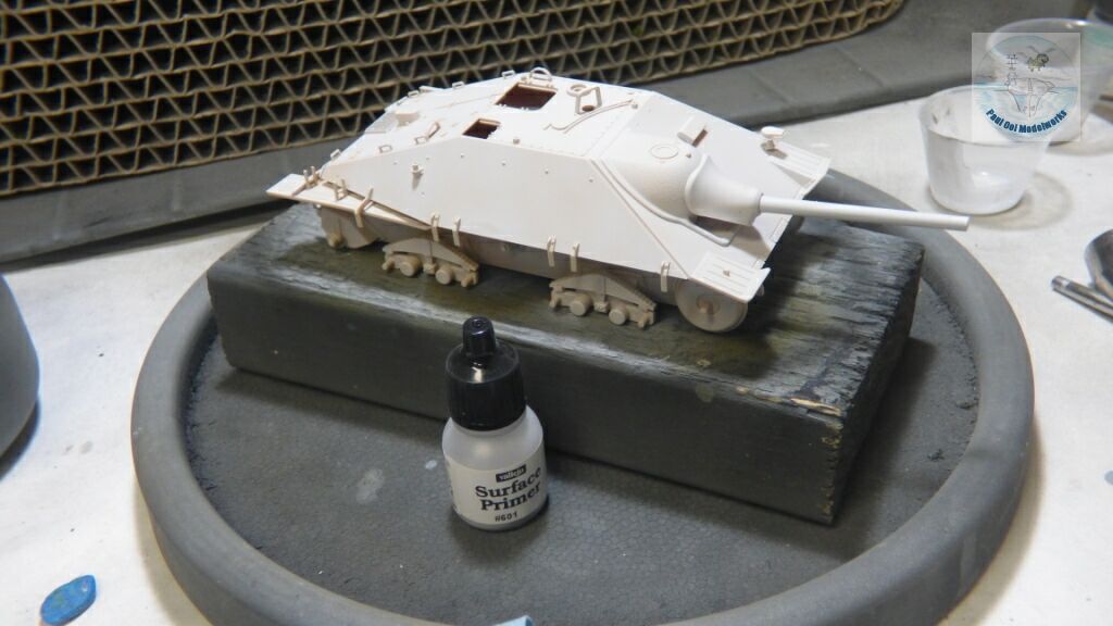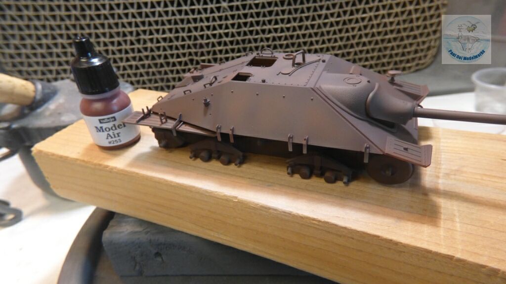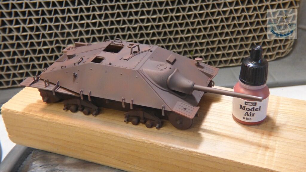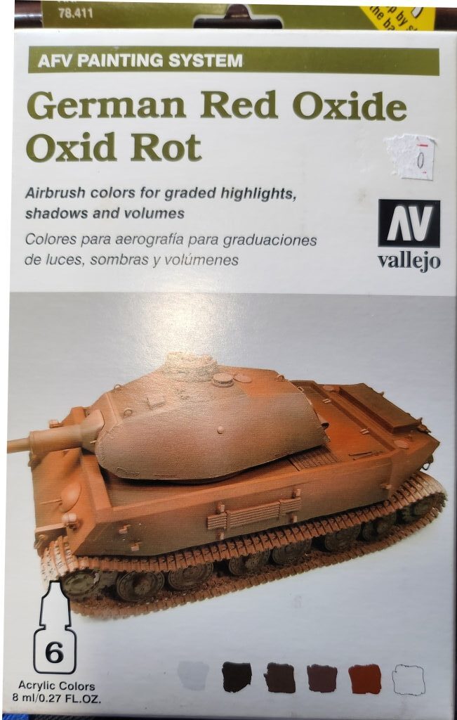 The Germans (and many other countries) apply a red oxide primer to their AFVs before the actual overall color (either German Grey or Dark Yellow) gets sprayed on. Towards the end of the war, due to the scarcity of paint, or trying to rush vehicles into action, some AFVs were seen in their red primer finish. As such, it is an interesting paint finish found in very late war vehicles. The primer would also tend to be a shade of different colors, depending on the primer batch used, and the effects of sitting around a factory floor or storage facility. This would range from almost dark brown to pinkish red. Creating this look in miniature is a challenge. For this project, I used Vallejo German Red Oxide AFV Painting System 78.411.